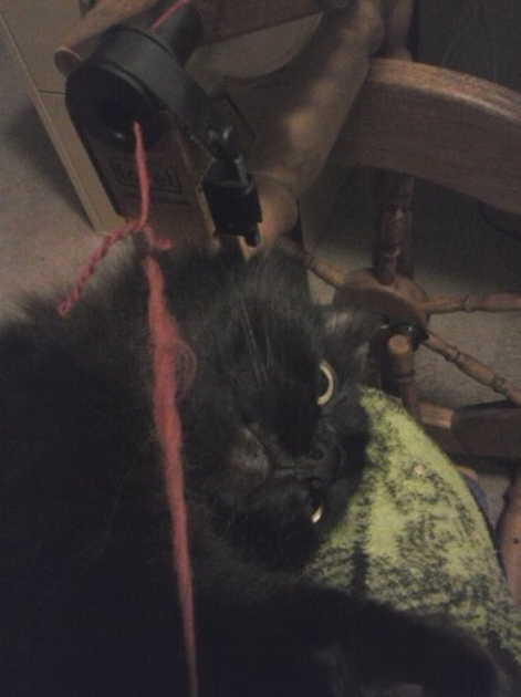 But I did get back to it! By February of 2015 I was hard at work at my wheel. A certain Anti-Spinning Feline Overlord was hard at work too.
