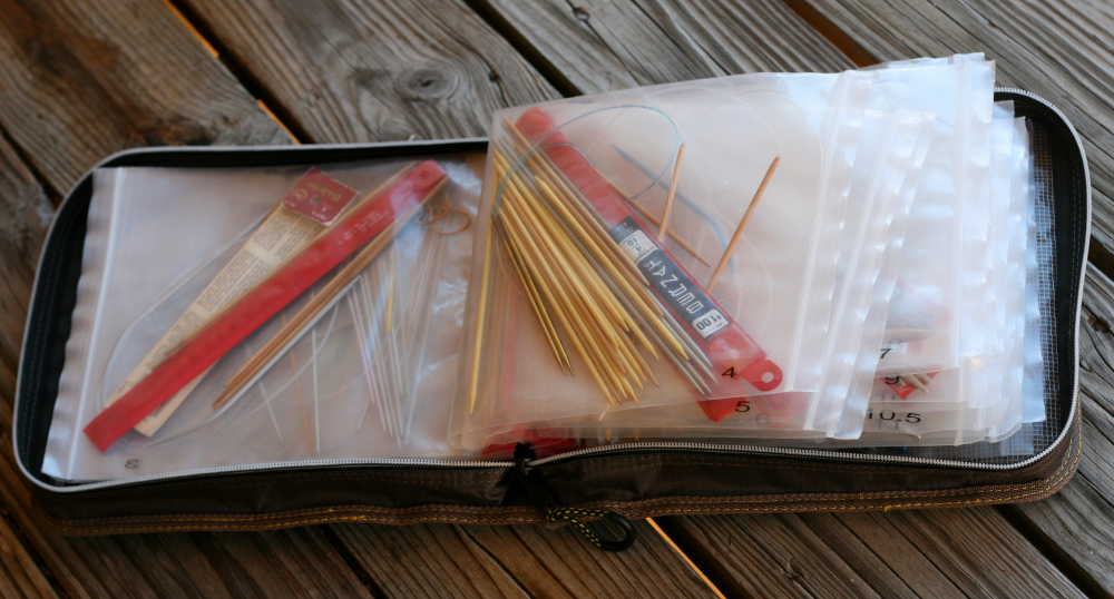 Its a zip-up canvas binder with ziplock-type baggies for holding your stuff. Except those baggies are far tougher than ziplock. They are made to hold fishing tackle so they’re really, really thick. I’ve had mine for months and no knit needles have poked through yet.