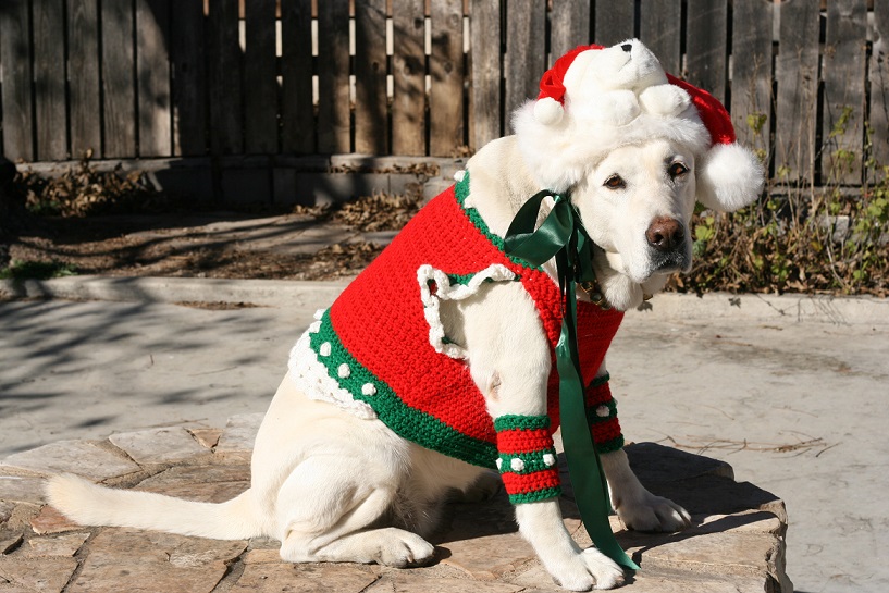 Last year I crocheted the barbarian princess dog a Christmas dress with matching leg warmers. The hat, shown here is not mine. But it is super cute and comes with a fetching ribbon that you can tie (tightly) under her chin. that ribbon is the key I tell ya.