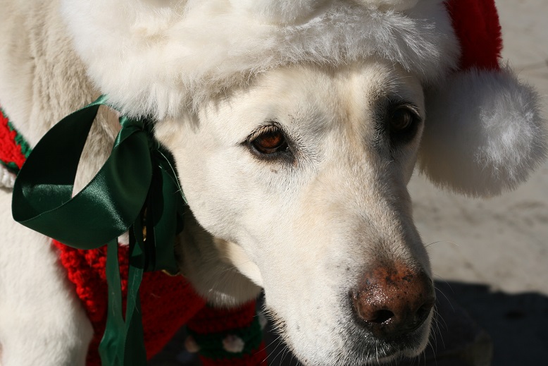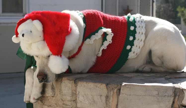 Mom also has The Great Beast and I dress her up too. Great Beast is a pure-bred white labrador that tops 100 lbs. Her lineage is 100% show dog and her attitude is 100% barbarian. Great Beast is almost always dirty and covered in the scent of some dead thing she found to roll in and therefore one of the happiest dogs you’ll ever meet. For Great Beast, every day is the-best-day-ever.