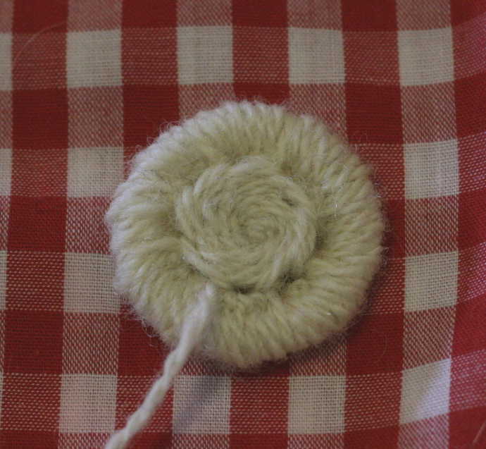The bottom left button is the one from the videos. The bottom center button is also made from Dorset Down. I used an unfinished single ply for that one instead of the finished two-ply yarn. I kind of like it better.