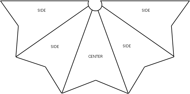 The shawl is made in wedges, five of them. There are four side wedges, 2 for the left side and two for the right side, split by a center wedge.