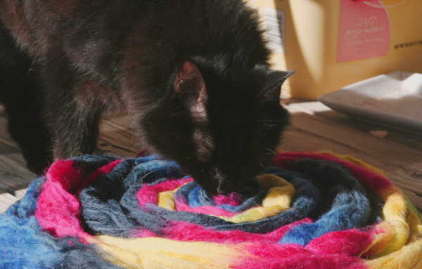 Love the bright colors and can’t wait to see the finished yarn. Beautiful. What a challange with the cats. I don’t have any but can see they want to get into everything.