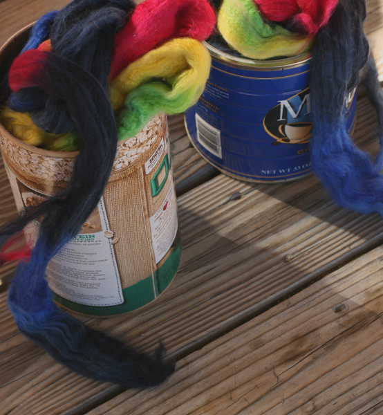 Kitty proof containers! I keep my roving in zip lock bags, but I kind of like the cans better. Love those colors.