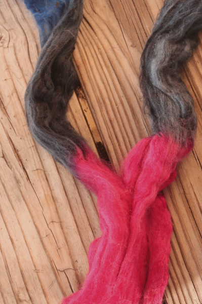 I split the fiber lengthwise while doing my best to keep the two sections even. The goal is to match up sections of color later when plying. The more evenly I can keep the two sections, and the more evenly I spin the singles, the better they will match up.