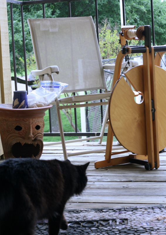 I put a screen door between me and her. I do most of my spinning out on my porch while The Evil One is in the house. And don’t say I should squirt her with water or firmly tell her no or give her a thwack on her butt. I’ve done all that. She is singularly UNIMPRESSED and refuses to recognize my authority. So Its banishment to the porch for me.