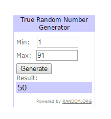 We are up to 91 entries. How about that! And Mr. Random Number Generator likes 50.