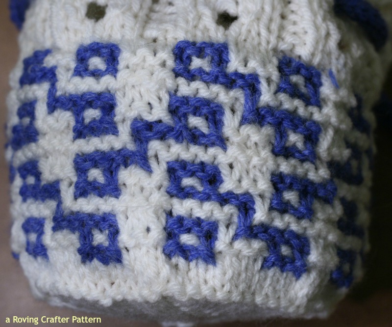 The mosaic pattern I used on theses cozies is a modification of Mosaic 16 from Mosaic Knitting by Barbra Walker. Its probably found in one of her four treasuries of knitting patterns as well.