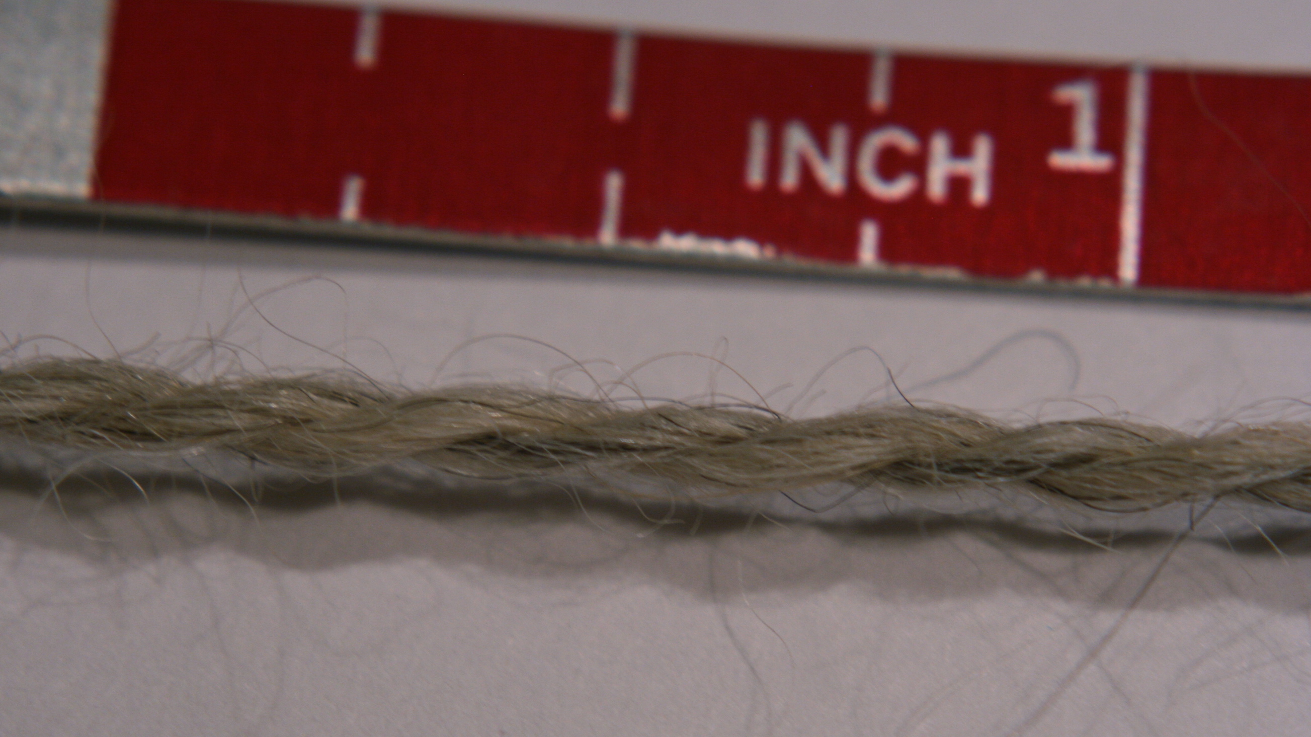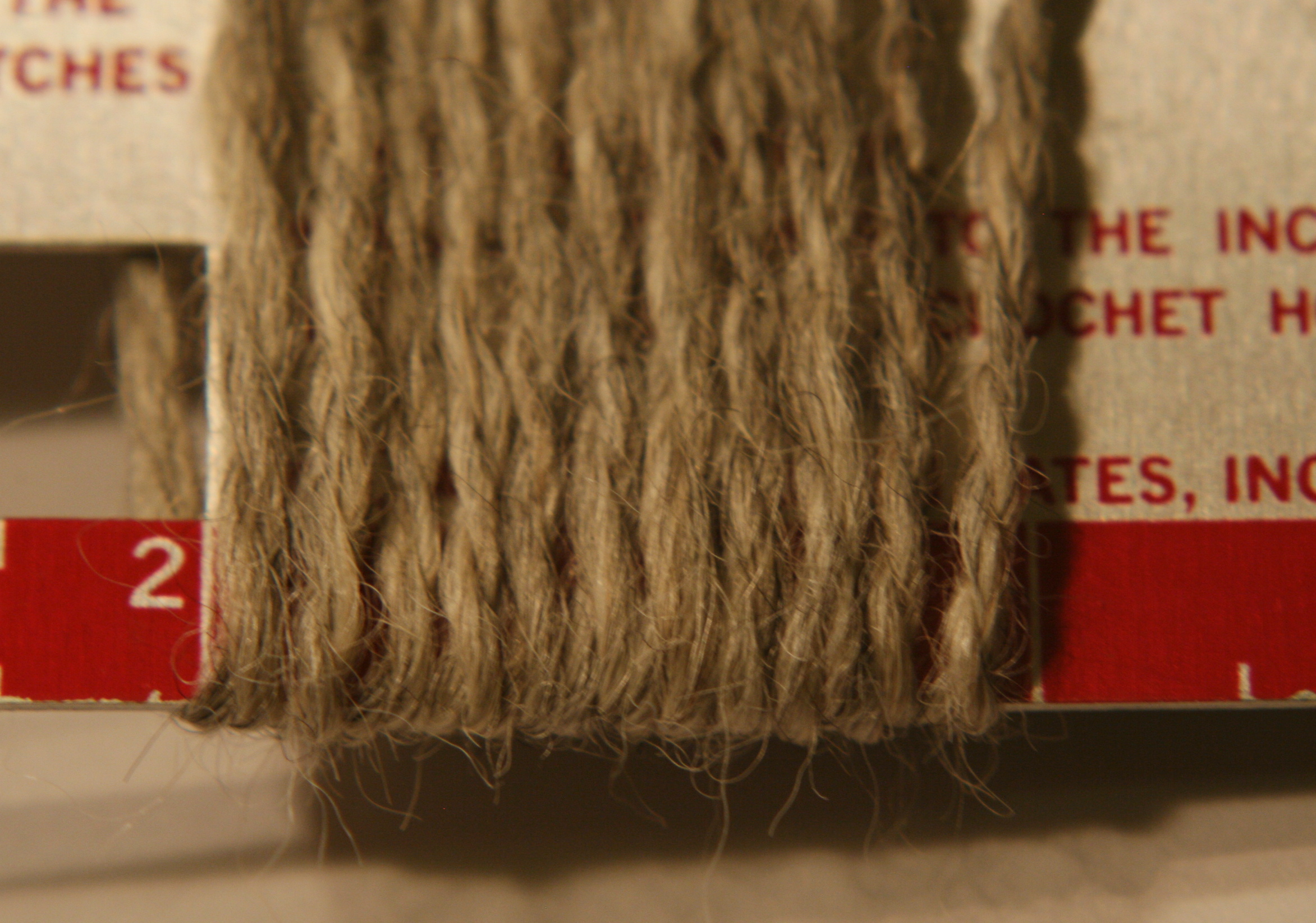 Sloppy! (I hate yarn like this. The things I do for you readers!) So, I pick out the double bands of black fibers and count them. There is room for some interpretation here (like I said, sloppy) but I see 4 twists in this inch. That’s 4 tpi in the single.
