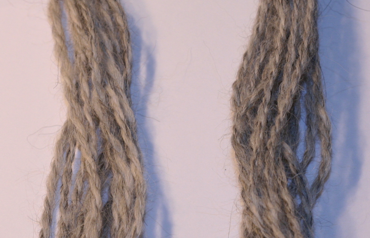 I count 7 tpi in this plied yarn. Its also less hairy and the plies have more definition. That is because the single was spun tighter. If you work it up, it will have more bounce, less drape, and better stitch definition than the first sample.