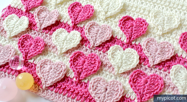Poke around and you’ll see stuff that is nowhere else on the ‘net. Some of the stitch patterns, like this way of making the applique hearts as you make the stripes underneath, are original designs. At least I think they are. I’ve haven’t seen it anywhere else. And all the patterns are free.