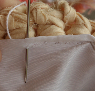 To stitch the top of the liner to the top of the tote bag, I switched to a thicker thread; crochet cotton thread, size 30. I used a running stitch… sorta. It looks like a running stitch on the liner side.