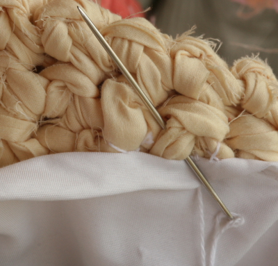 | I started with old bed sheets. Those were cut up into strips and turned into yarn. | ![]() |