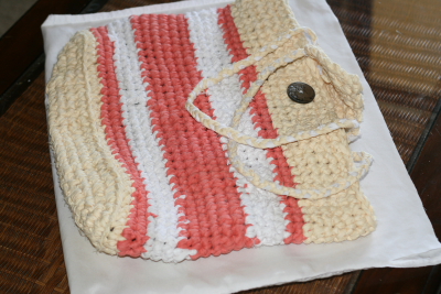 | Once I had the “yarn”, I started crocheting the bag, working from the bottom up. | ![]() |