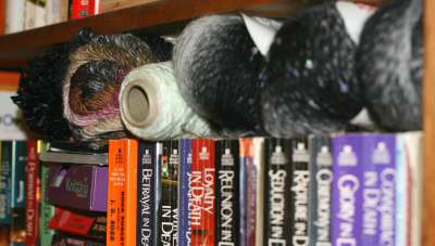 There is a basket of half-balls on the coffee table and a jar of half balls under the sideboard table. There is yarn on top of the bookcases and on top of the books in the bookcases and behind the books in the bookcases. There is probably more in other places that I can’t think of right now.