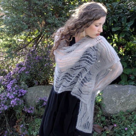 Its made with 4 balls of Silken Kydd and nearly 1500 (optional) seed beads. Its a stole, aka rectangular wrap, and I do like that shape.