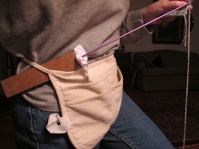 A knit sheath, aka knit stick, aka knit fish, is any device that you use to anchor a long knit needle to your waist. By anchoring it there you free up a hand, usually the right one, to just work the yarn. That means your right hand can act like a shuttle to move stitches from the left needle to the right needle. It also means you can knit really fast. Ms. Wright claims that experienced knitters can get up to 200 stitches a minute this way.