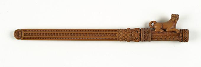 A knit sheath can be very simple or very elaborate. Most are pieces of wood shaped to fit comfortably in your belt with a small hole drilled into one end to put your working needle.