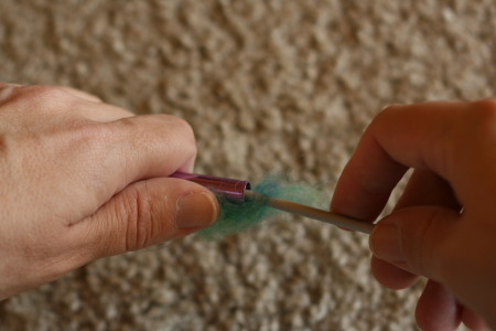 I grabbed some fiber from the stash to stuff it with and these 11 inch vintage double pointed needles to try it out.