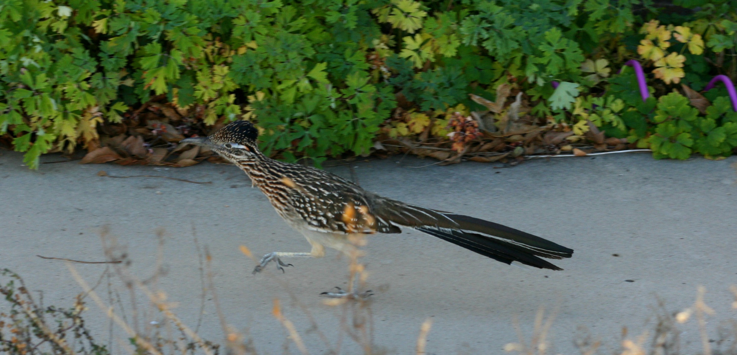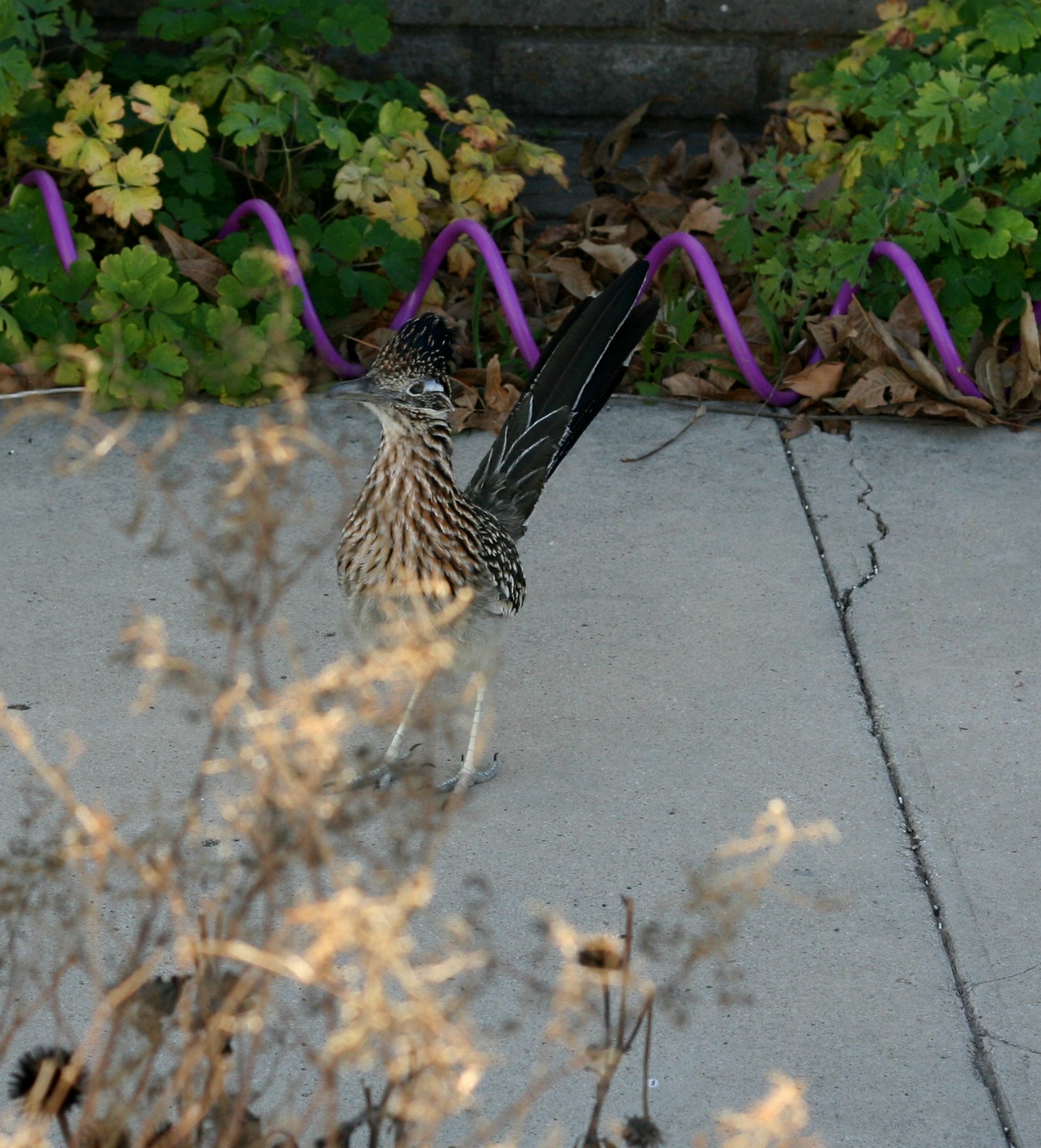 Finally I spent a bit of time with my camera getting a picture of the neighborhood roadrunner. I’ve named him/her Scooter. Scooter’s hunting territory includes Mom’s house and he/she will come right up to you. They are so freaking fast they can afford to be bold. Scooter knew that he/she could run up, get a good look at me, and be gone before I could take two steps.