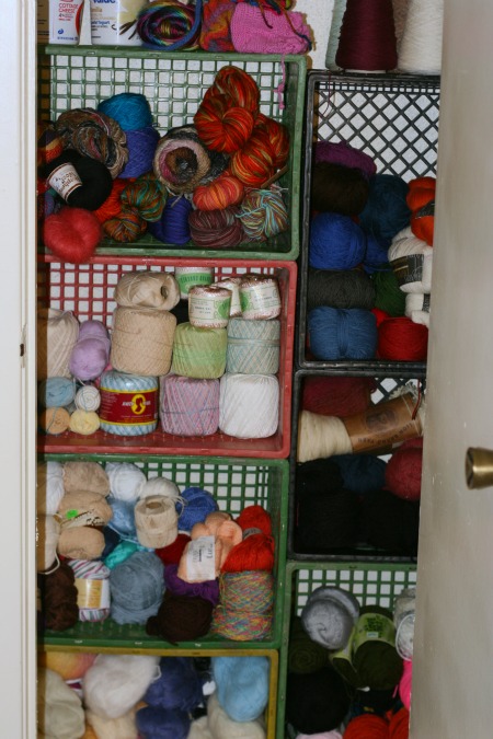 So my stash has been getting bigger and bigger. Stashes do that. It used to all fit into this one closet, the yarn closet, but then it started to creep out. Before long I had yarn in baskets and bowls and in the clothes closet and the book cases. Then there was yarn in my pantry. I was okay with that. I had yarn in my kitchen cupboards and I knew that was not the way most people lived but I didn’t worry about that.