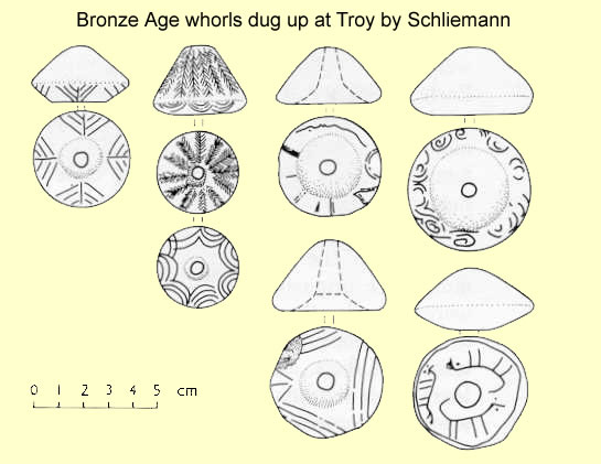 In Neolithic times, the spindle whorls are made stone. At least those that have survived are. By the bronze age we begin to see a mix of stone and baked clay whorls. In Prehistoric textiles, Elizabeth Barber explains that in the excavation of the City of Troy “the sequence begins in the 7th millenium with a few flat, round perforated stones” and in the Early Bronze Age there is “an explosion of baked clay whorls”. One excavator records that 8000 to 10,000 whorls were found in Troy II, which is believed to be the Troy that Homer spoke of in his epic tale.