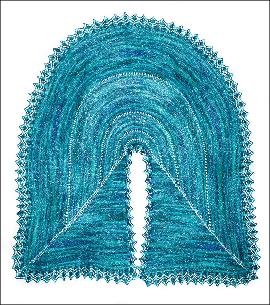 It wants to be a Pie Are Square Shawl. The Pie Are Square design is a modification of the more common Pie Shawl. They are worked flat and have these front panels that drape over your shoulders. Its a shawl that doesn’t fall off. And you can make them big, big, big.