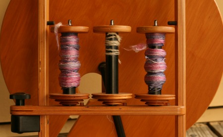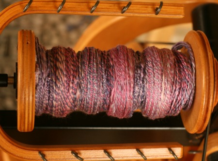 Then I plied it up and at a high speed. That got me 150 yds plied, and since I only had 2 ounces of it to begin with, 150 yds is pretty good. Its about sport weight.