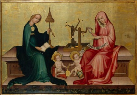 But it isn’t just powerful royals who spin (like I do). Painters in Medieval Europe loved to show The Virgin Mary spinning yarn (like I do). Here is my personal favorite: The Virgin Mary, St. Elizabeth and their two very important boy children. And yarn is happening.