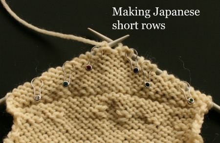 Next comes my favorite, Japanese short rows (also called wrapless short rows). Its the method that gives me the best results. When I make these, I can barely see the edges of my shortened rows. But they are slower to knit because you have to stop and add safety pins or row markers.