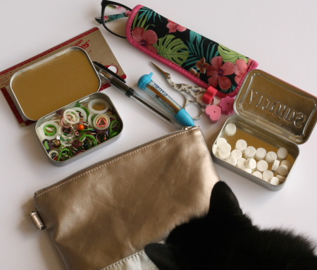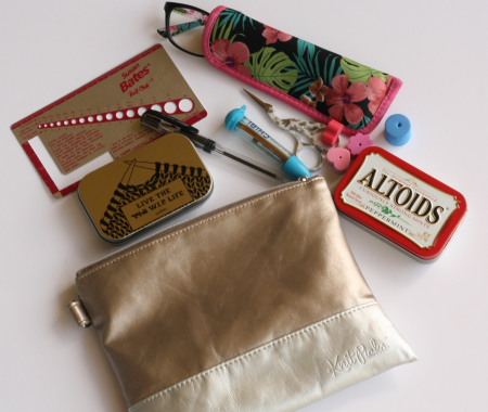 I carry around a pen, my reading glasses, my Chibi tapestry needles, a pair of small scissors, foam beads which I use as needle tips to keep my stitches from sliding off knit needles, a needle/yarn gauge and two candy-type tins.
