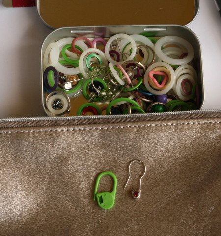 The other has my colorful assortment of stitch markers and row markers. Those row markers, or something similar like safety pins, are absolute necessities. You’ll need them for holding a dropped stitch that you just now noticed and won’t be able to fix until you get your project back home.