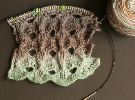 And I’m studying all these lace patterns when I’m supposed to be focusing on Shetland lace. Shetland lace has lots of waves and eyelets and you usually find left slanting decreases matching up to right slanting decreases to make these beautiful symmetrical shapes. I’ve been trying to stay focused on Shetland lace becasue I have more experience with that style. There certainly seems to be more Shetland lace-type resources available… at least in English.
