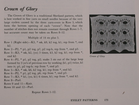 You know, if Barbara Walker hadn’t included this motif in her first Treasury, I’m not sure we would still have it today. You don’t find many patterns that use this motif. I went looking for a knit pattern, something free, something that made good use of the Crown of Glory to link here. Couldn’t find one.