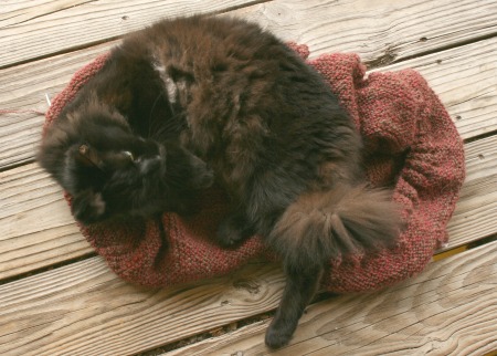 Not just cats love hand spun alpaca. I had a dog snatch a goodly bit of fluff out of my fiber basket as I was spinning at an outdoor craft show. His owner returned the goodly bit of fluff once discovered and apologized profusely as it was quite slobbered upon. Another dog was content to lie by the spinning wheel as it whirred away. My cat doesn’t discriminate against any fiber and plops on my lap at the hint of me trying to work on a fiber project.