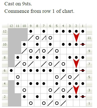 I’m using a lace edge called Diamond Edging that I found on knitting-and.com. Its a twelve row repeat and that link includes instruction in both written and charted form.