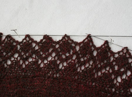 Not that you don’t need straight pins when you use blocking wires. You do. Just not nearly as many. So next I started stretching the shawl out. I pulled gently on those wires and then used a few pins to hold them in place.