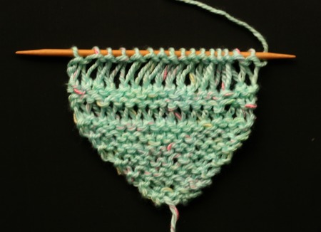 Row 6: k the knits (from previous row) and let all YO’s drop