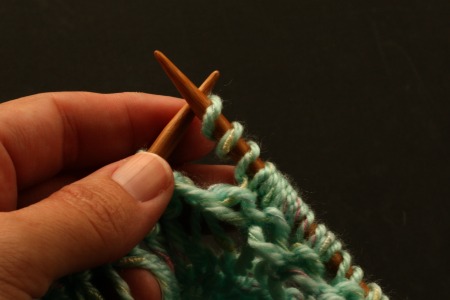When you get to the end of this row, stretch out the work and you’ll see the knit stitches are a bit bigger then the should be…