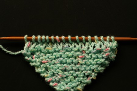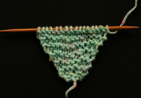 Row 1: k1, ssk, k until 3 sts remain, k2tog, k1 (14 sts)
