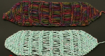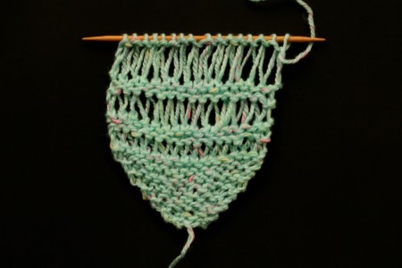Row 10: k the knits (from previous row) and let all YO’s drop