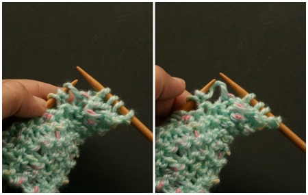 Then there is the super easy way to make drop stitches and that is the method I used in my headband. The basic technique is to add in a bunch of yarn-overs on one row. One the following row, all those yarn overs are dropped off the left needle. You don’t knit/purl them. Just let ’em fall. The result is all the non-yarn over stitches get stretched out and big. The more yarn overs you add in and let drop, the more stretched out the remaining stitches become.