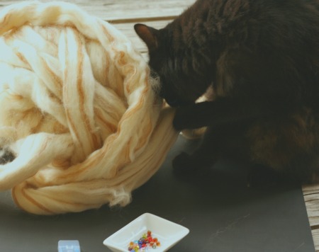 Here is the last of that series. Added at the request of more than one roving crafter… how to just add the beads in at the very beginning when you are making the yarn.
