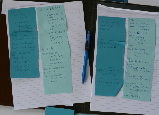 I’m knitting a bit slower than usual. Since I normally knit pretty slow that former statement means I’m knitting at a snail’s pace. But that’s okay. Its not like anyone is waiting on the pattern for this little creation, right? You’re not waiting on me to publish this are you? I hope not because the pattern is currently a collection of sticky notes arranged on a couple pieces of paper.