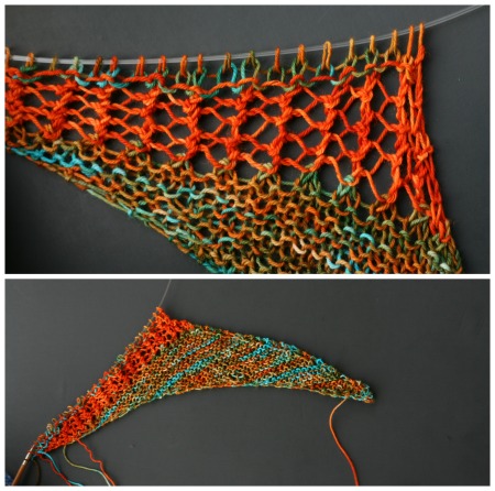 Its an oblique triangle shawl/wrap. Its the kind of pattern that you start on three stitches and grow it out until its big enough. Or until you run out of yarn. Or until you’re sick of it and want to work on something else.