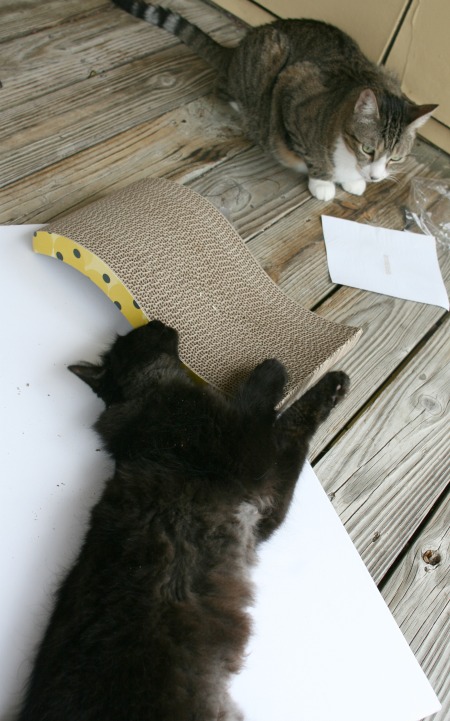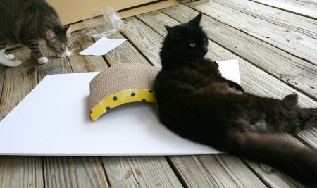 Cowardly Boy Cat gets to have the wrapper for the cat scratcher. He can’t have the actual scratcher.