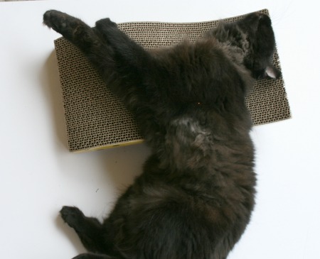 Yeah. Actually I don’t know why that makes the cardboard scratcher super-awesome but it does. For reasons only cats fully understand, curved cat scratchers are 14000% better than the flat ones. And because they are so much better, there is no sharing.