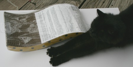 Its a slow death, one that involves having little bits of scratched out cardboard flung happily about for weeks. The curved cat scratcher slowly disintegrates, sags, looses all structural integrity, and collapses. Then I throw it away. But until that final cat scratcher death occurs I have to vacuum up cardboard bits seven days a week. That is at least six more days a week then I want to vacuum. So after every cat scratcher death I swear I will never buy another one.