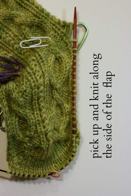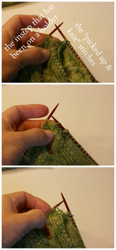 If you’re feeling a bit uncertain about the “pick up & knit” maneuver, I have a free video tutorial that should help. You do the pick up and knit along one side of the heel flap, work across the instep stitches in pattern (those are stitches that have been hanging out on a holder) and then pick up & knit along the other side of the heel flap.