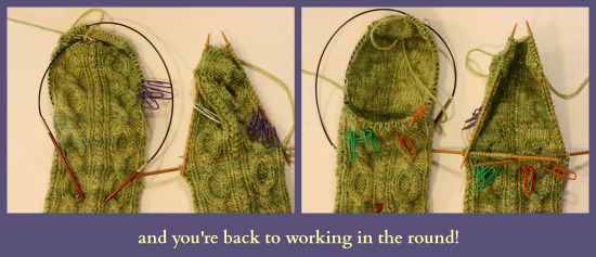 What about after the heel is turned? Ahh. Then you have to get back to knitting in the round. You do that by picking up and knitting along the side of the heel flap.